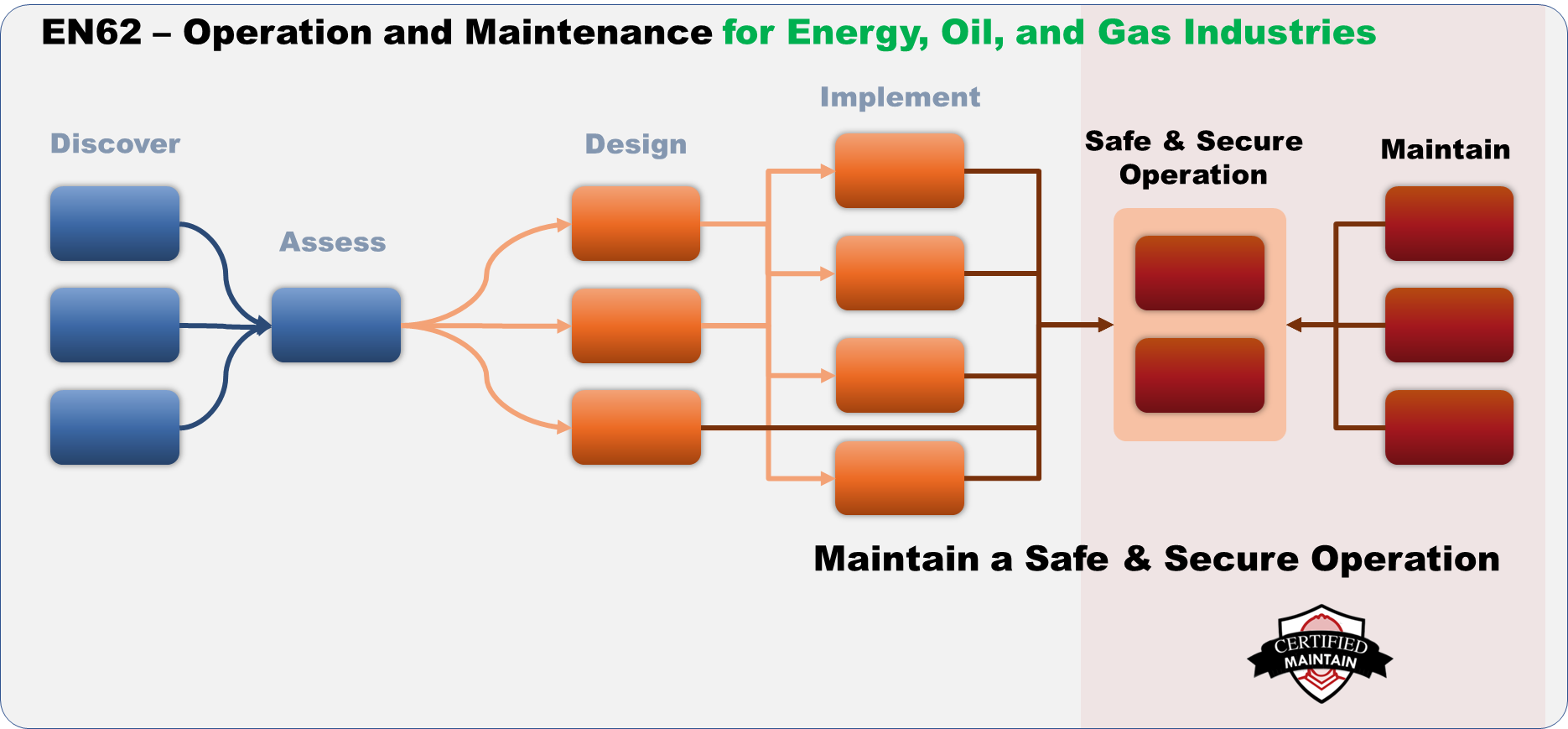 One of the most important objectives to be achieved by the attendees at EN62, is to ensure a safe operation of the plant, execute preventive and corrective maintenance, respond to alerts, and audit for compliance. This is the largest phase in the cybersecurity lifecycle.